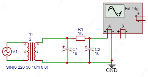 | 图1.1.15 变压低通滤波电路仿真图 | 图1.1.16 变压低通滤波电路仿真示波器图 |